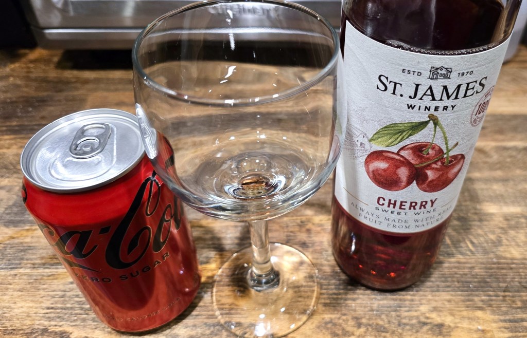 Since St. James Winery offers this wine as a good ingredient to cocktails, I was really looking forward to my favorite cola-based cocktail: a kalimotxo. I poured 4 ounces of Coke Zero over 4 ounces of this cherry wine. Let me tell you, it was the best cherry coke I’ve ever had!