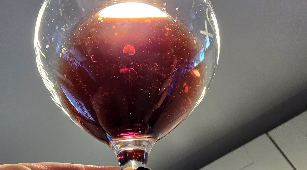 Taking a big whiff from my water spot-stained glass (seriously, I couldn’t let it go), I got scents of red jam. It was a very fruit-forward smell. In the back, I was able to pick up hints of leather and dirt.