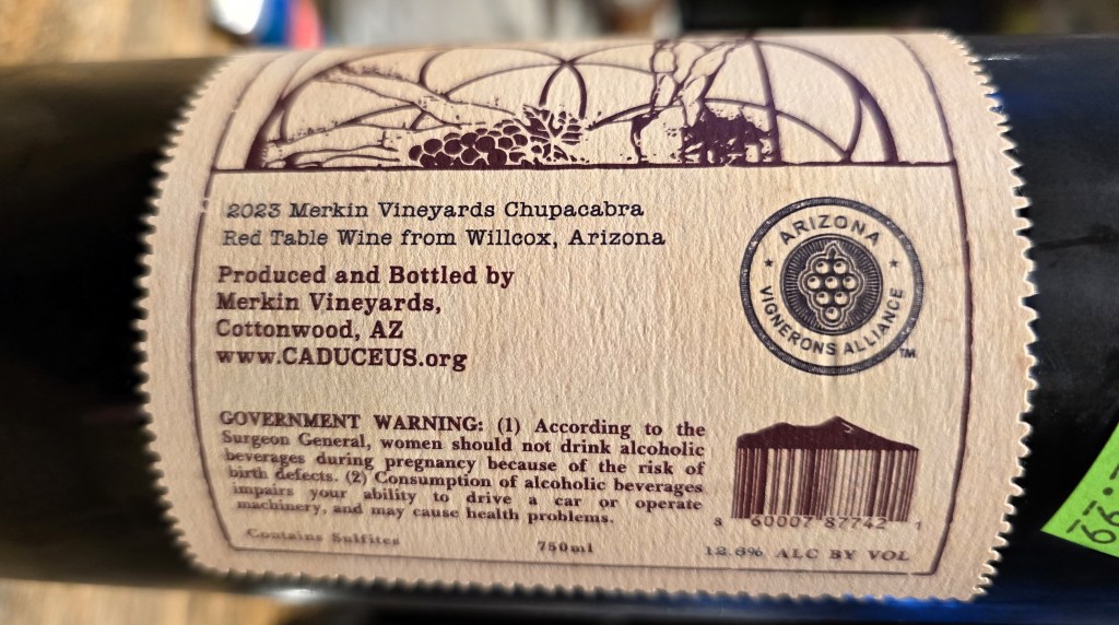 But as Merkin Vineyards says, their Chupacabra is always primarily grenache, syrah and monastrell, grown in the Bulk Memorial Vineyard, east of Tucson, 4,300 feet above elevation.